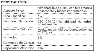 Son almohadillas con fundas de polipropileno rellenas de fibras orgánicas naturales, para ser utilizadas en los derrames sobre tierra, pérdidas de aceite de mantenimientos de maquinarias o motores, actuando como colectores de aceite e hidrocarburos en general. Absorbe y encapsula varias veces su propio peso.